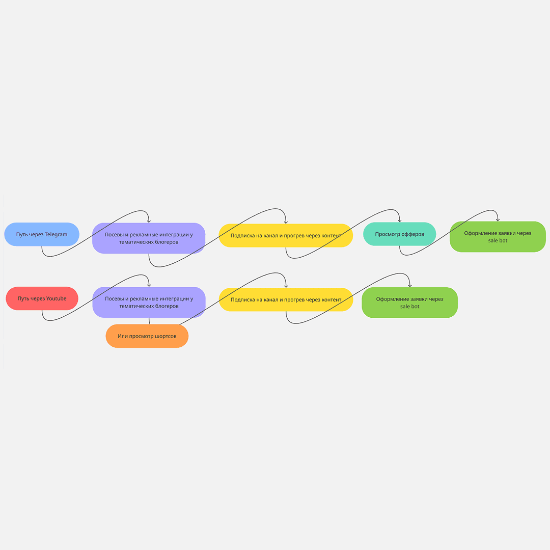 Через YouTube — просмотр шортсов → переход на канал → узнавание бренда → запрос на консультацию