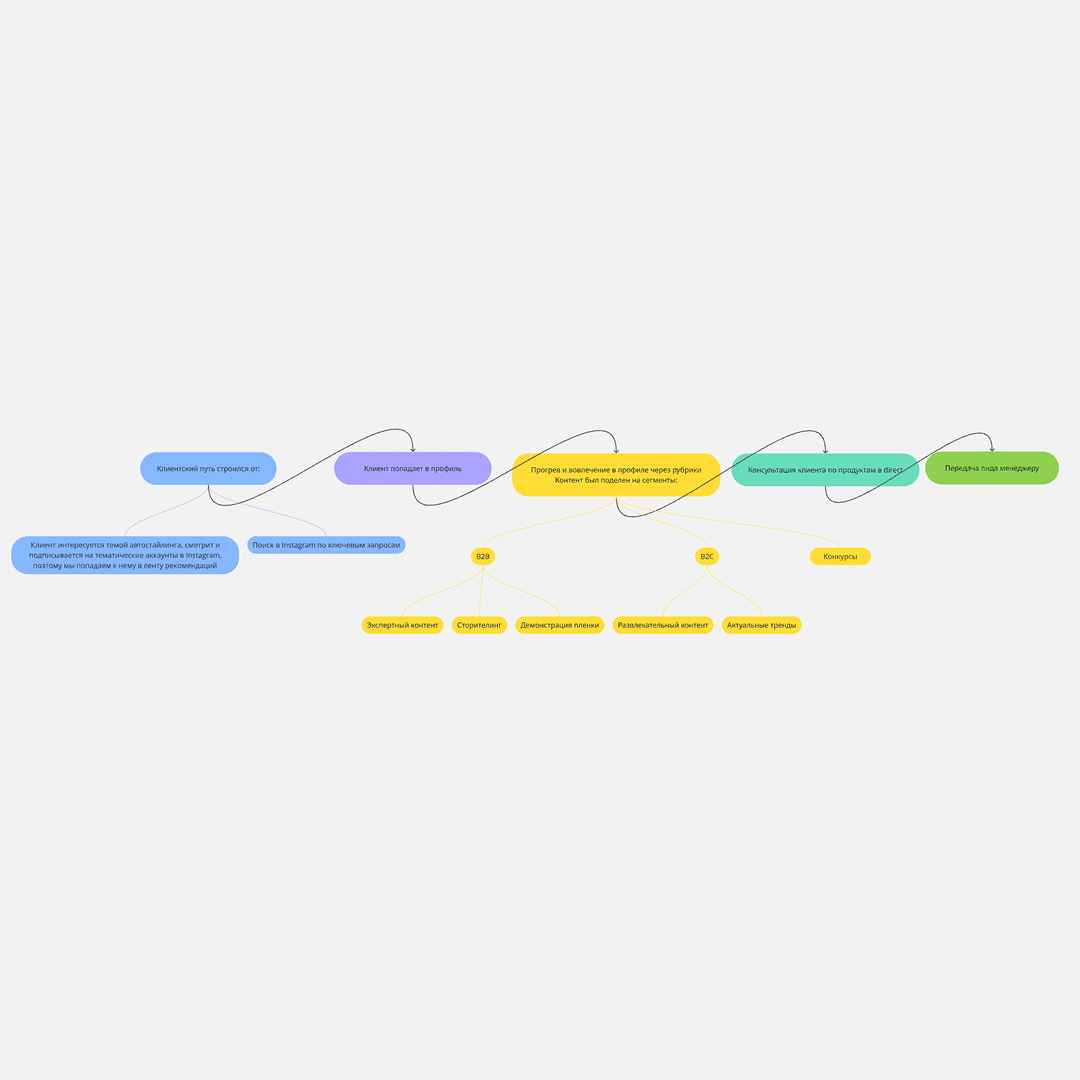 Клиентский путь строился от интереса к автостайлингу → подписка на Instagram → вовлечение через конкурсы/сторителлинг → заявки в директ или заявки на сотрудничество.